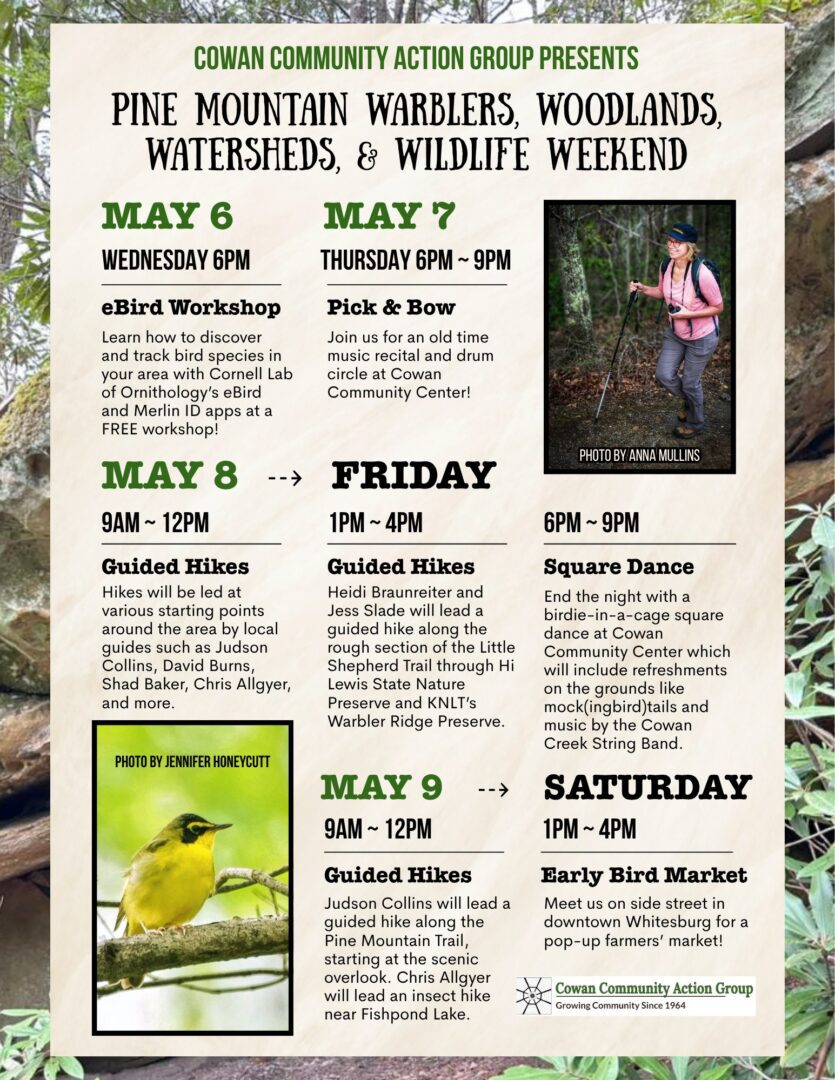 The Pine Mountain Warblers, Woodlands, Wildlife & Watershed Weekend is coming up. The Cowan Community Center Action Group is putting on events from May 6-9. There will be a variety […]