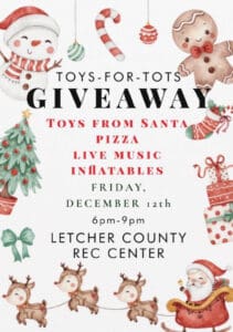 There is a Letcher County Toys for Tots Christmas Giveaway next Friday December 12 during and after the Whitesburg Christmas Parade.